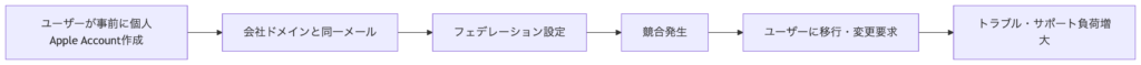 すでに社員が会社のメールアドレスで個人Apple Accountを作成している場合、フェデレーションはできません。
