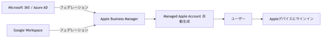 フェデレーションとは、既存のID(Microsoft 365 / Google Workspace)でAppleにログインできる仕組みです。